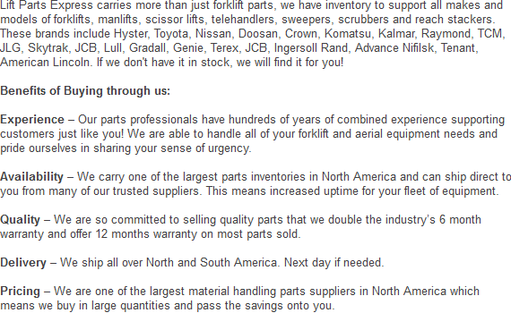 All our forklift parts are offered at the best prices. Phone now to get an estimate on one of the attachments or parts we offer. Call us at: